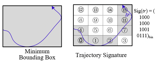 我们还提出了更为精确描述轨迹形状的方法。如图8所示。传统的描述轨迹形状的方法是使用一个矩形框,该矩形框很大空间都与轨迹位置无关。因此我们提出了采用多个小格子来描述轨迹形状的方法。更精确的轨迹形状描述允许我们设计出了更好的过滤方法,更进一步的提高了查询效率。