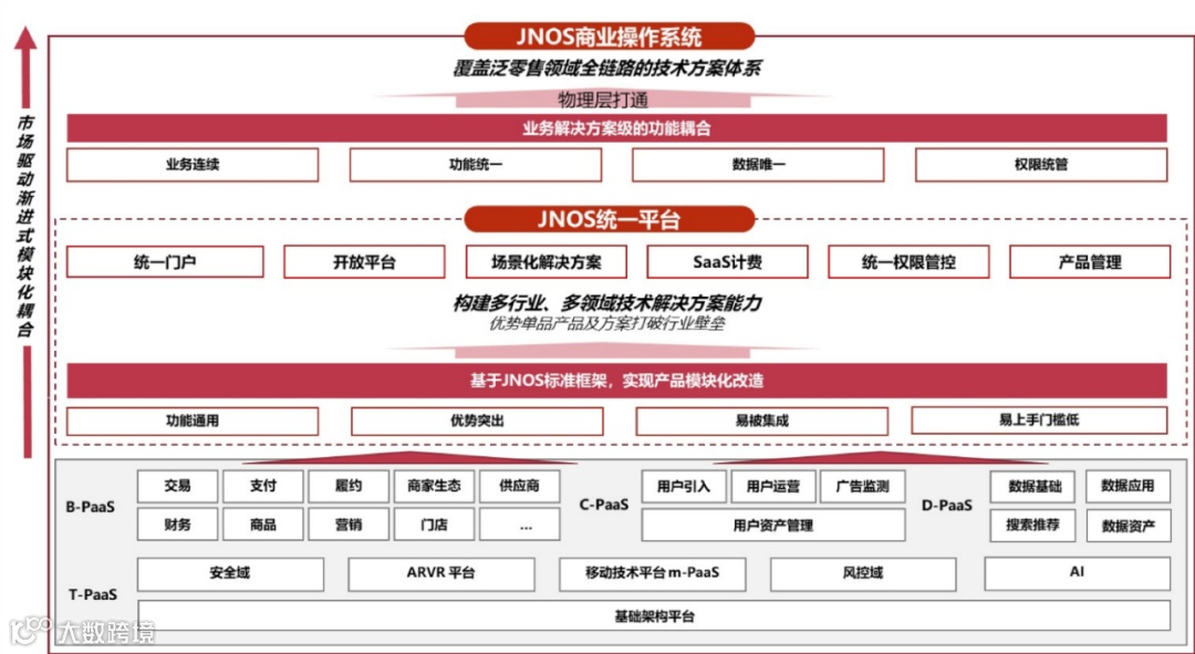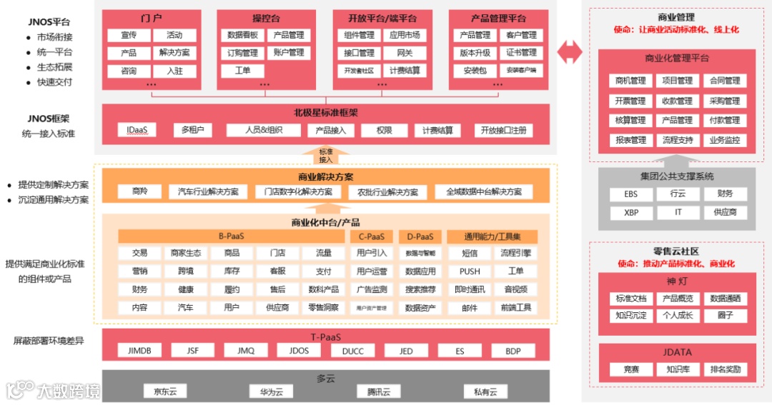 JNOS统一平台聚焦零售产品的商业化基础设施建设,致力于做零售云生态的水电煤,提供商业化的标准规范、标准流程与标准基础设施。