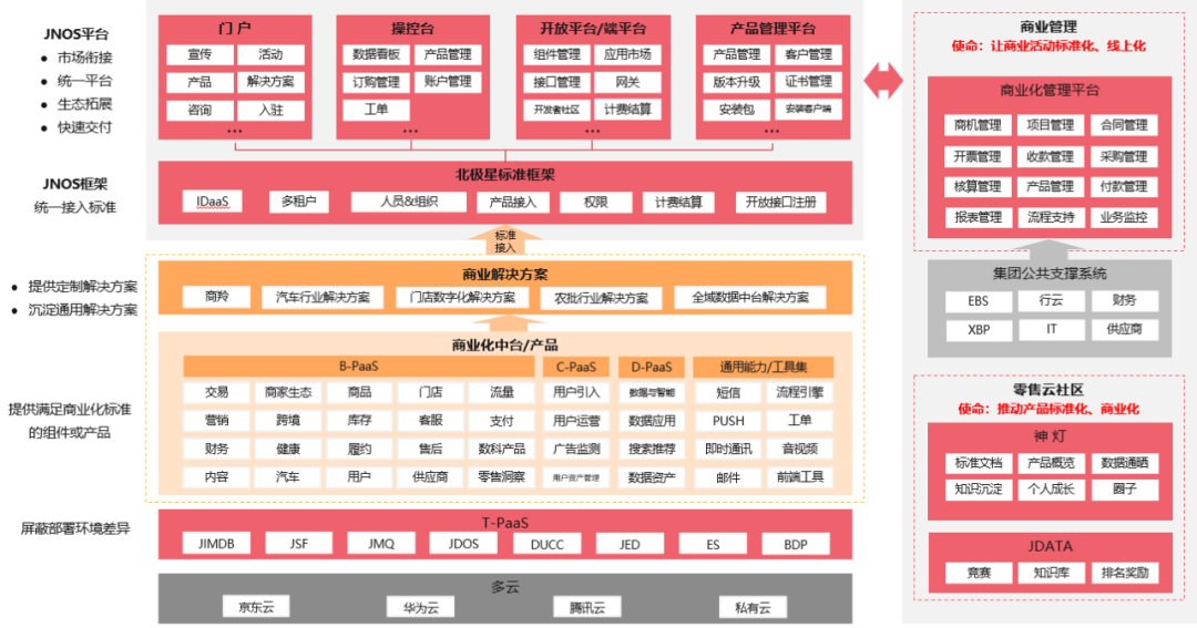 为精确解决上述问题,保障各个商业产品快速接入零售云,JNOS提供了一系列快速响应市场变化的落地方案、方法论和标准,通过打造B-PaaS、C-PaaS、D-PaaS、T-PaaS以及JNOS统一平台的通用化能力,将京东零售成熟的泛零售行业解决方案与方法论对外输出,实现技术实施、运营流程以及业务活动的全面标准化。