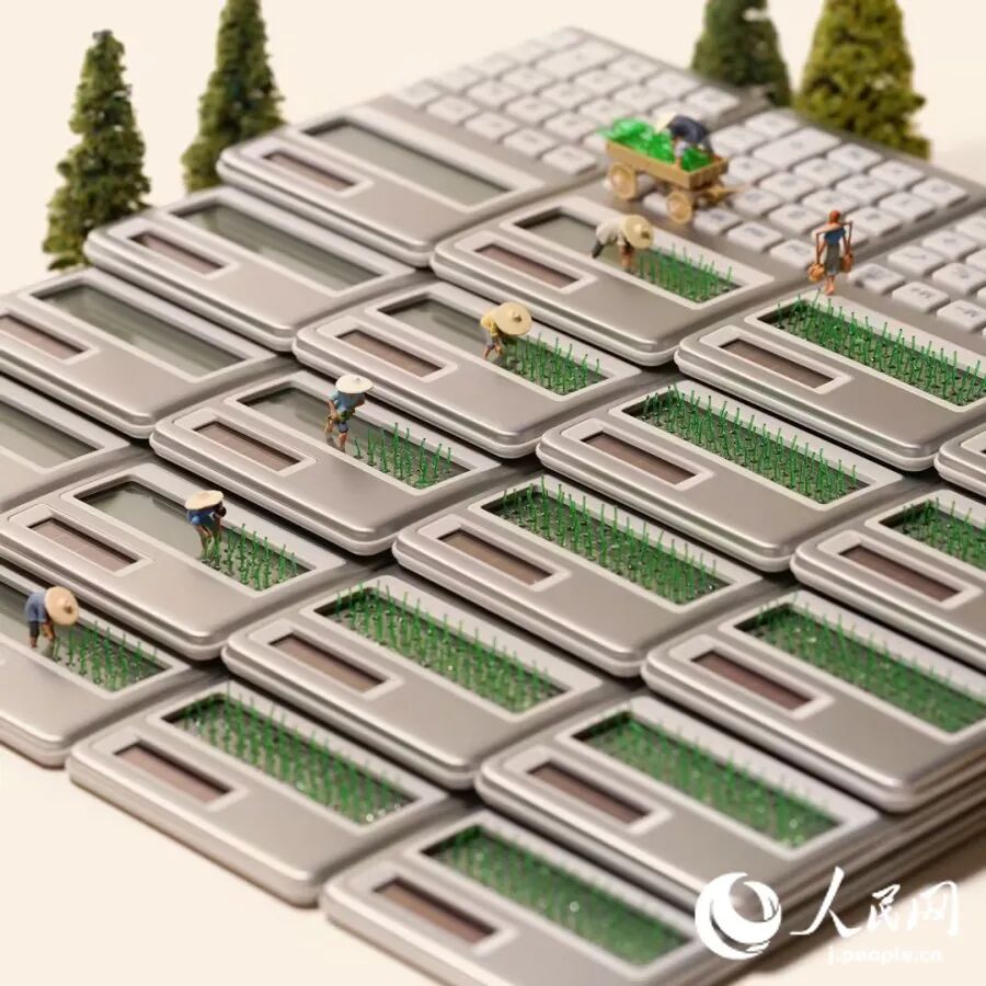 「電卓を田んぼに見立て、デジタルのモノを自然のモノに見立てるというギャップのある見立てが面白い」と田中氏。また「実際の田植えも天候や水を引き入れるタイミングなどを計算しているので、それを計算機で表現する面白さ、さらに電卓のソーラー電池で稲が育つという想像を膨らませてもらってもいい」としている。作品タイトルは「田卓(でんたく)」。(写真提供・MUJI HOTEL 北京)。