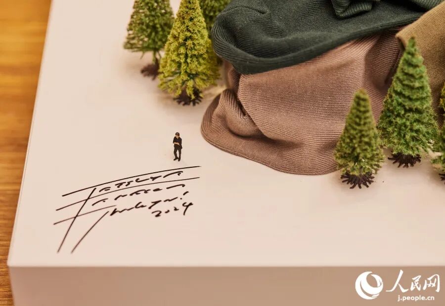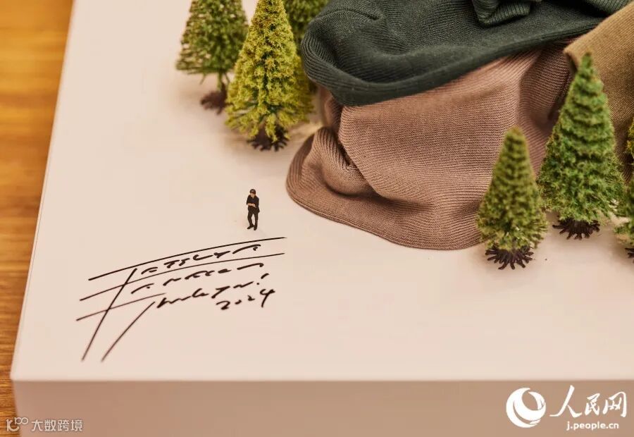 作品「想像の長城」の左端に書かれた田中達也氏のサインと田中氏自身のミニチュア人形(写真提供・MUJI HOTEL 北京)。