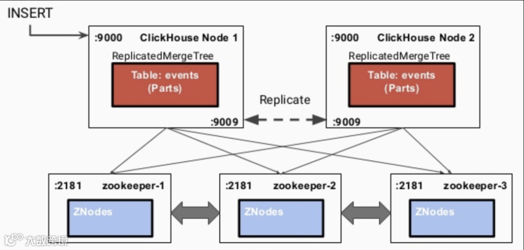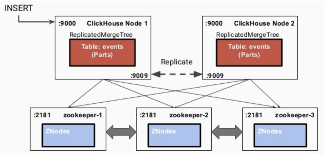 ClickHouse基于Replicated MergeTree引擎与Zookeeper实现了复制表机制,在创建表时,可以决定表是否高可用。上一节的statistics_replica表,其中/clickhouse/tables/{shard}/statistics_replica表示Zookeeper中对应副本表的node。当数据写入ReplicatedMergeTree表时,过程如下:
