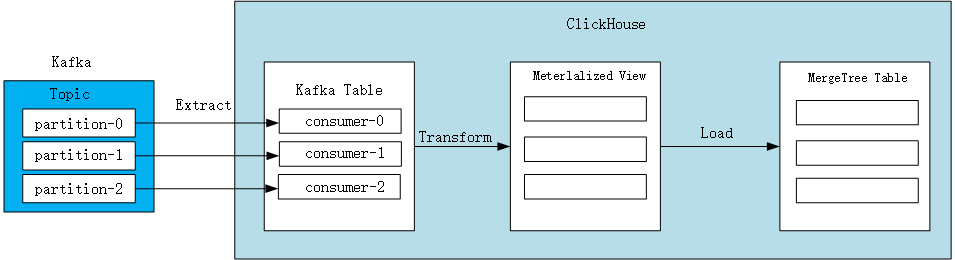 ClickHouse基于kafka引擎表的数据接入可以看做是一个典型的ETL过程,数据的抽取(Extract)是通过建立一张kafka引擎表,产生消费端订阅kafka topic实现;数据的转换(Transform)通过物化视图实现;数据最终加载(Load)进MergeTree表,实现实际数据存储。