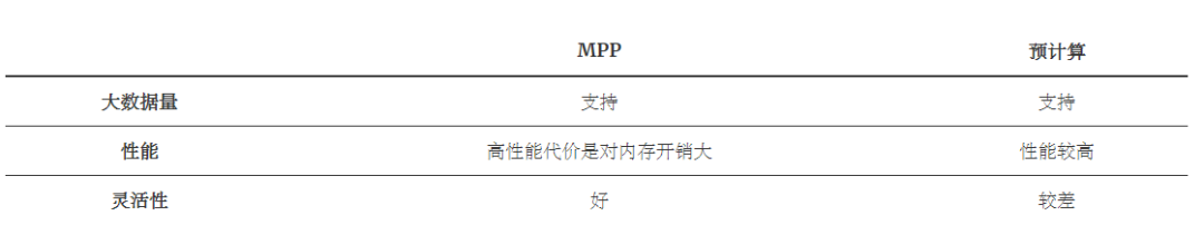 1. MPP架构。MPP架构特点是服务将接收到的查询请求发送到每个计算节点,待计算节点计算完成后,通过一个节点将最终结果汇总在一起得到最终结果。典型实现如Presto、Impala、SparkSQL、Drill等。MPP架构的特点是支持灵活的数据模型,要达到较高性能对内存开销大。