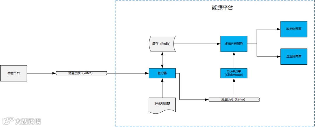 京东能源管理平台主要是对各种表计(水表、电表、天然气表等)设备上报的计数进行多维度分析统计、AI诊断和出具能耗报表等。表计的原始数据通常都是累计值,如电量度数就是一个从电表安装以来,所有耗电量的一个累计。因此,我们在数据接入前会引入一个差分器对数据进行预处理,使得进入ClickHouse的指标数据变成可直接累加的指标,方便利用SQL对接ClickHouse实现多维的查询服务。架构图如下: