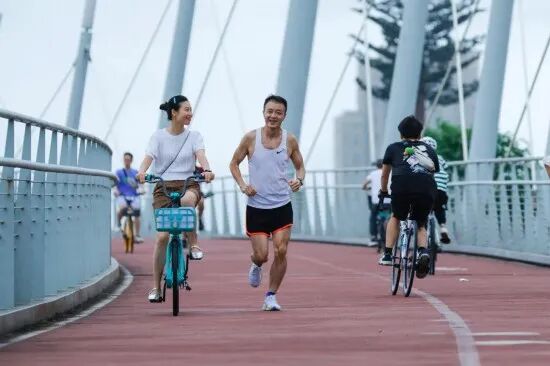 妻の羅丹丹さん(写真左)に励まされながら成都天府緑道を走る陳さん(写真右、撮影・瀋伯韓)。