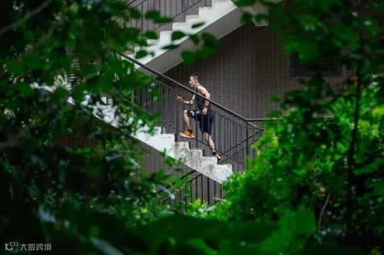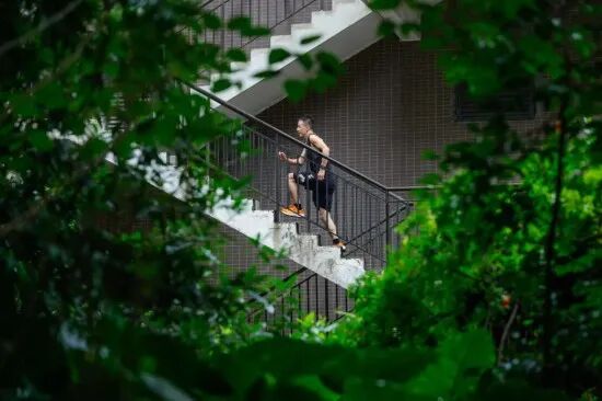 団地内の階段を上ってトレーニングする陳志剛さん(撮影・瀋伯韓)。