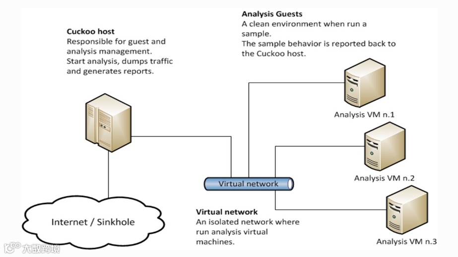 Cuckoo由Cuckoo host、Analysis Guests、Virtual network构成。cuckoo host是调度中心,analysis guest是具体执行样本的沙箱环境,两者通过虚拟网卡连接。当提交样本到cuckoo host后,cuckoo host会调度一个空闲的analysis guest节点,同时将样本传递给所选择的沙箱节点进行自动化分析,分析结束之后将沙箱节点采集到的分析数据进行汇总,最后输出分析报告。