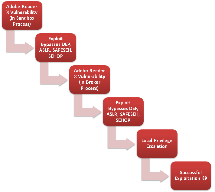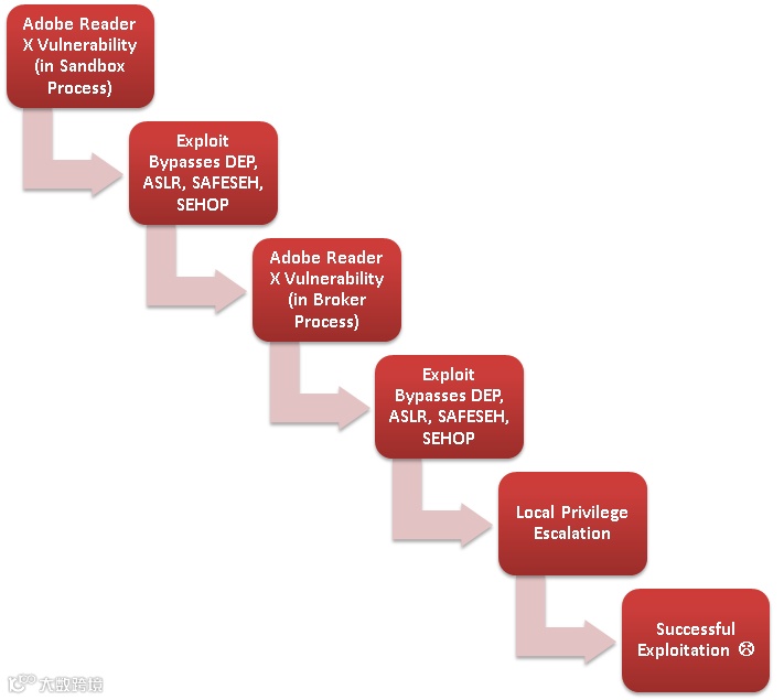▲Adobe Reader X加入沙箱之后的漏洞利用流程▲