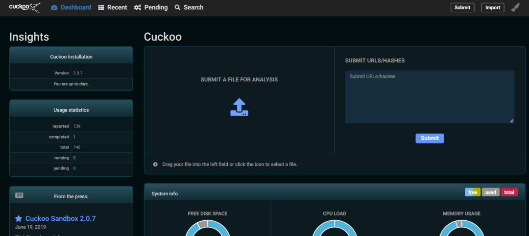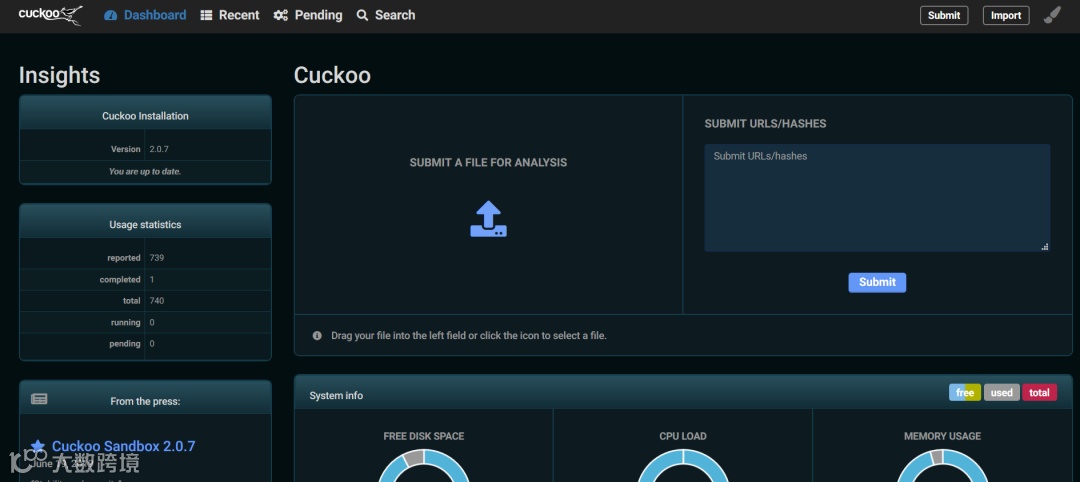 Cuckoo沙箱是一个自动化的恶意样本分析系统。通过web界面或者沙箱系统提供的web api提交可疑文件,沙箱系统即可自动分析,并在分析完毕后提供一个详细的报告,概述该文件在沙箱中执行时的行为。