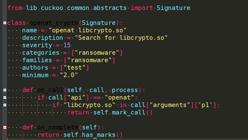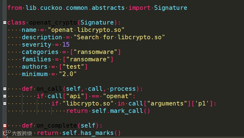 至此,我们对Cuckoo通过SystemTap监控syscall的过程有了一个整体的了解,SystemTap会把采集到的syscall及其参数返回值以报告的形式返回给Cuckoo,Cuckoo的分析系统可以分析报告。使用者可以通过添加策略(signature)使对SystemTap采集的结果进行分析。