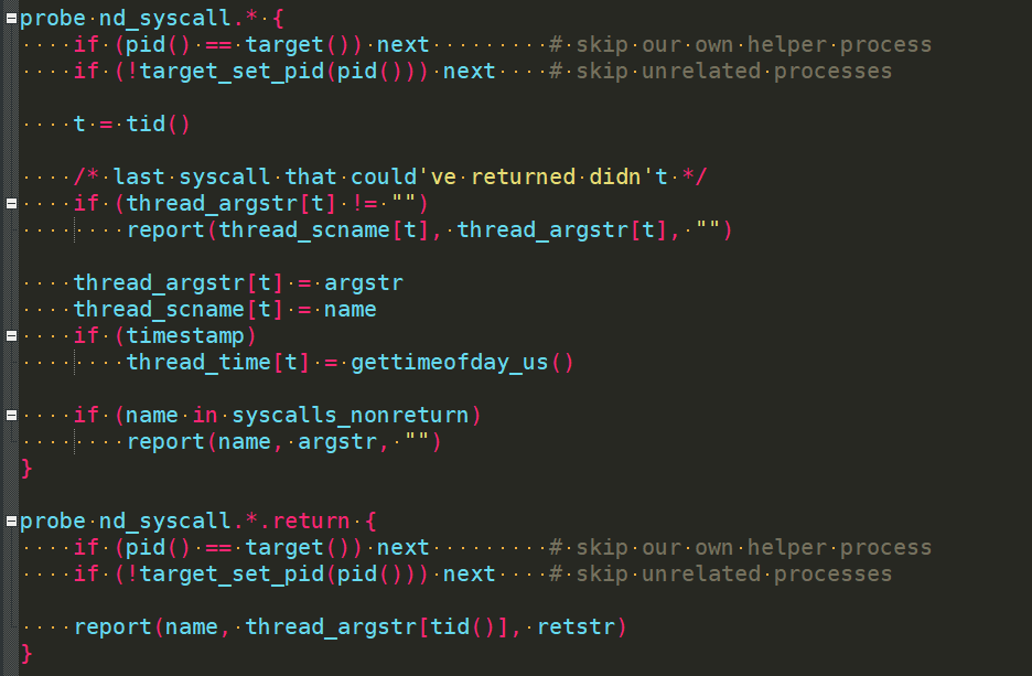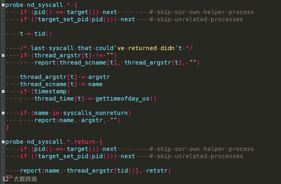 SystemTap是一个框架,具体的分析逻辑需要通过SystemTap脚本实现。SystemTap脚本由两部分组成:events和handlers,即事件和相应的处理程序。事件及其相应的处理程序统称为探针(probe),一个SystemTap脚本可以有多个探针。下图为cuckoo中用来监控系统调用的探针。