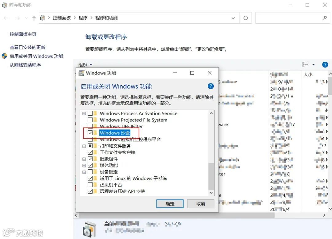 微软在Windows 10 18305版本之后的专业版和企业版中加入了沙箱功能,可以通过Windows功能界面开启沙箱。