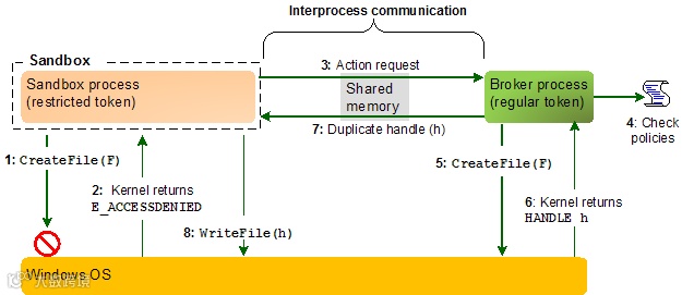 加入沙箱之后Adobe Reader不信任的代码可以运行,但是只给予较低的权限,请求高权限的操作时需要通过另外一个中介进程来完成,同时很多敏感的Windows API调用会被拦截,从而保证Adobe Reader不被轻易的漏洞利用。以文件操作为例,典型的文件操作流程为:(1)调用CreateFile(2)权限允许的情况下获取文件句柄(3)执行ReadFile/WriteFile进行读写操作。加入沙箱机制之后,程序是运行在沙箱进程中的:直接调用CreateFile被禁止。文件操作需要中介进程(Broker Process)进行中转,中介进程会进行一系列的校验,防止恶意操作。当全部校验通过后才会调用CreateFile并获取文件句柄。