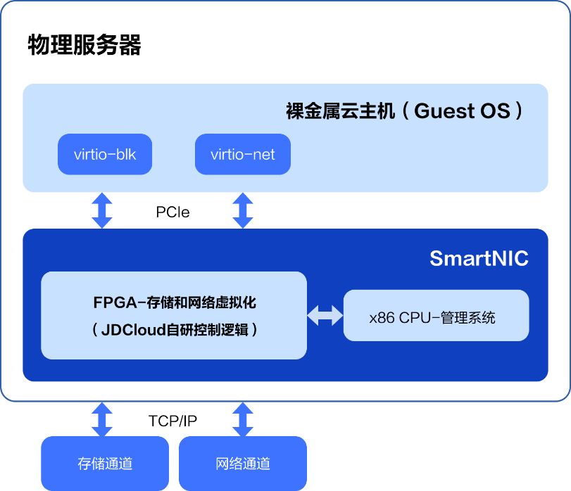 在最新的京东智联云第二代裸金属架构中,使用了FPGA支持virtio-blk,virtio-net虚拟化,更具通用性的同时,FPGA将处理局部性和重复性强的负载,发挥在低延迟的流式处理方面的优势,CPU将处理较为复杂的负载,发挥在批量同构数据处理方面的优势。