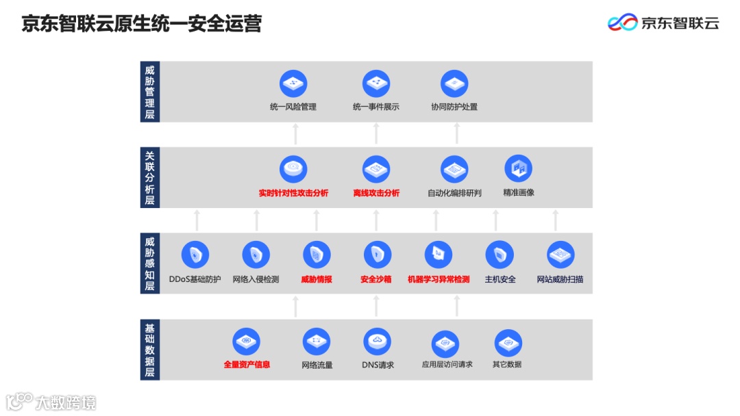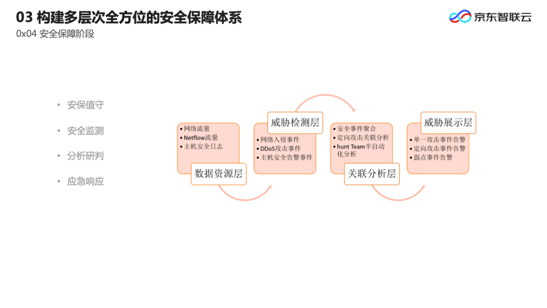 如上图所示,京东智联云在安全保障体系阶段通过态势感知等安全产品提供涵盖数据资源层、威胁检测层、关联分析层、威胁展示层的多层次安全监测和态势预测。安全运维团队可以直观地获知安全事件和安全态势,从而推动事件处置。