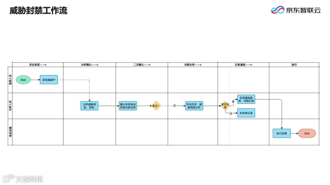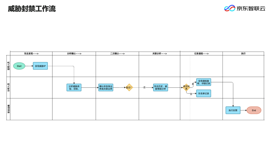 标准化同样要在安全保障阶段进行严格执行,以威胁封禁操作为例,京东智联云把威胁封禁工作流实现了标准化、制度化,以便于保障工作在由不同班次不同部门进行执行时能协调有序。其总体流程如上所示,在发现威胁后由分析人员进行威胁分析,理清攻击目标、攻击方法和形式,输出事件初始报告;然后由其他人员进行二次确认,分析攻击来源以及是否为系统误判,输出事件确认报告。在确认攻击后需要对高危险动作进行封禁操作,封禁IP对所有关联系统人进行通报,同时要告知止损策略,输出事件处置报告;对于低频攻击则会加入观测列表,观测活动特点并进一步处置分析,形成处置记录。同时,在安全保障阶段,需要例行化汇总输出安全态势,为上层提供决策材料、积极响应监管部门要求。
