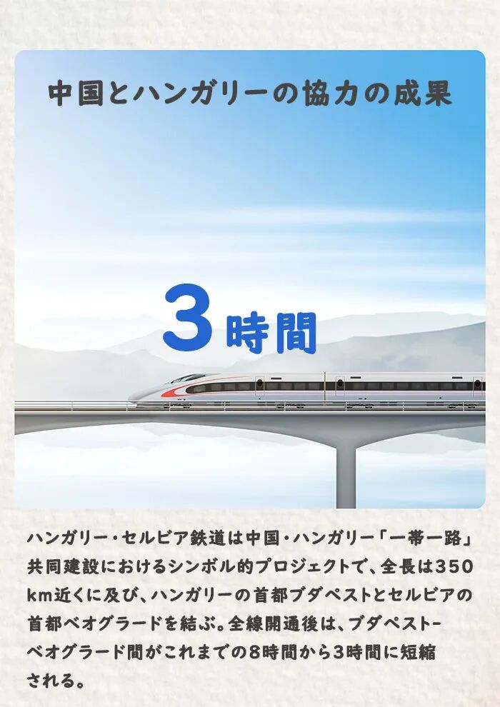 ハンガリー・セルビア鉄道は中国・ハンガリー「一帯一路」共同建設におけるシンボル的プロジェクトで、全長は350km近くに及び、ハンガリーの首都ブダペストとセルビアの首都ベオグラードを結ぶ。全線開通後は、ブダペスト-ベオグラード間がこれまでの8時間から3時間に短縮される。