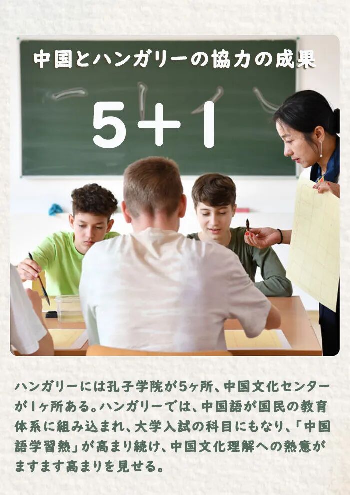 ハンガリーには孔子学院が5ヶ所、中国文化センターが1ヶ所ある。ハンガリーでは、中国語が国民の教育体系に組み込まれ、大学入試の科目にもなり、「中国語学習熱」が高まり続け、中国文化理解への熱意がますます高まりを見せる。
