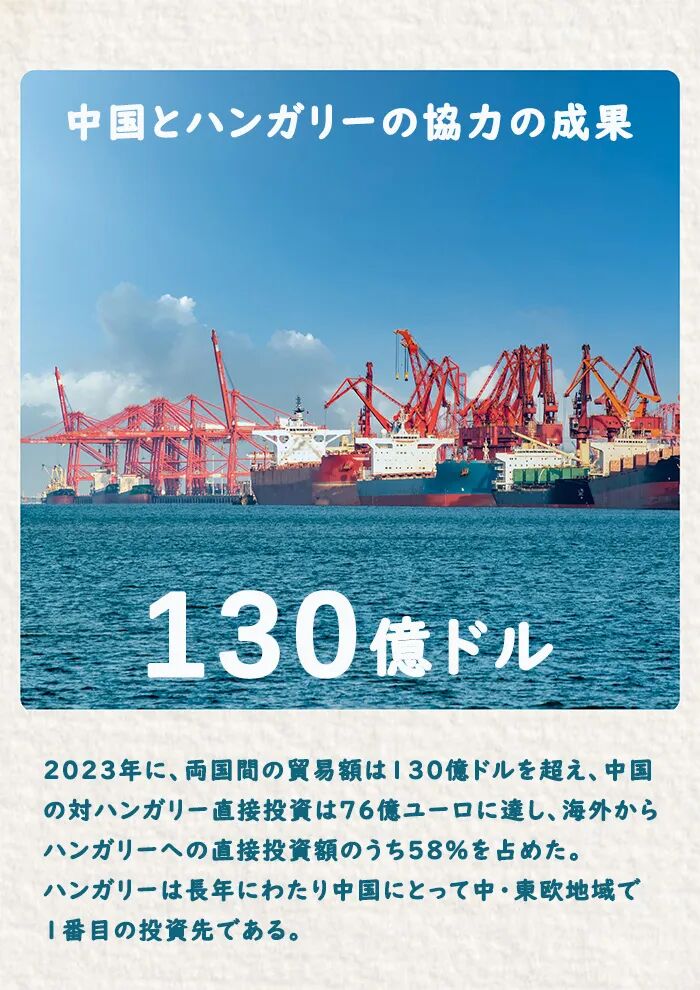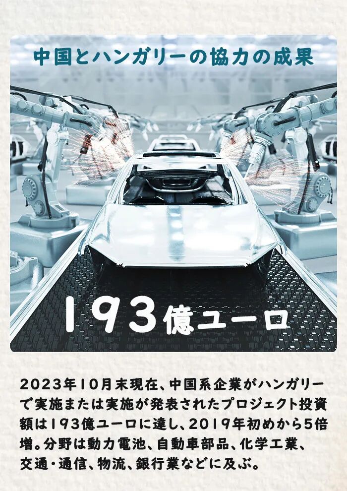 2023年10月末現在、中国系企業がハンガリーで実施または実施が発表されたプロジェクト投資額は193億ユーロに達し、2019年初めから5倍増。分野は動力電池、自動車部品、化学工業、交通・通信、物流、銀行業などに及ぶ。