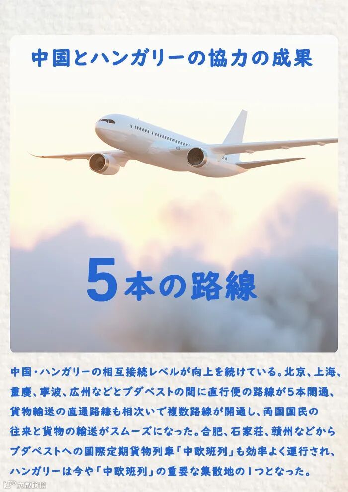 中国・ハンガリーの相互接続レベルが向上を続けている。北京、上海、重慶、寧波、広州などとブダペストの間に直行便の路線が5本開通、貨物輸送の直通路線も相次いで複数路線が開通し、両国国民の往来と貨物の輸送がスムーズになった。合肥、石家荘、贛州などからブダペストへの国際定期貨物列車「中欧班列」も効率よく運行され、ハンガリーは今や「中欧班列」の重要な集散地の1つとなった。