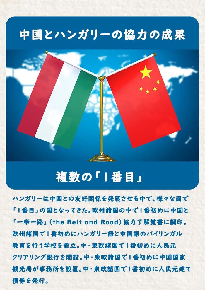 ハンガリーは中国との友好関係を発展させる中で、様々な面で「1番目」の国となってきた。欧州諸国の中で1番初めに中国と「一帯一路」(the Belt and Road)協力了解覚書に調印。欧州諸国で1番初めにハンガリー語と中国語のバイリンガル教育を行う学校を設立。中・東欧諸国で1番初めに人民元クリアリング銀行を開設。中・東欧諸国で1番初めに中国国家観光局が事務所を設置。中・東欧諸国で1番初めに人民元建て債券を発行。