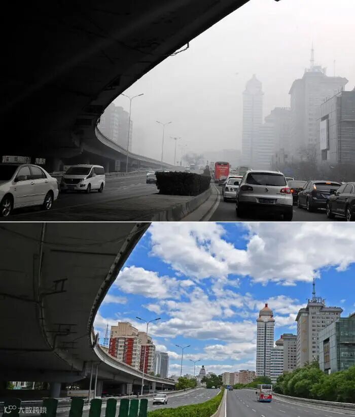 2013年1月11日に撮影された煙霧に包まれた北京のある立体交差橋の横の建物(写真上、撮影・何俊昌)と2022年6月6日に撮影された北京の環状道路「二環路」西部にある立体交差橋付近の景色(写真下、撮影・陳曄華)。