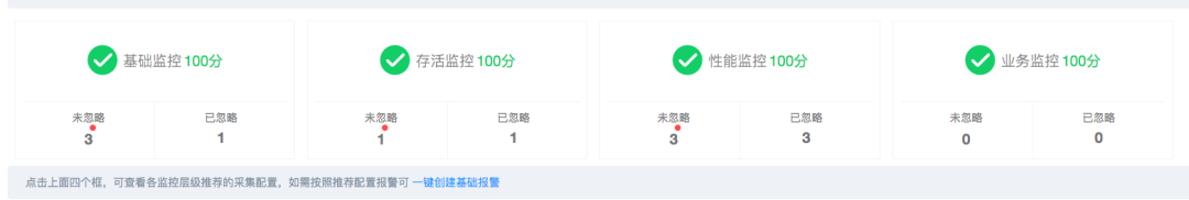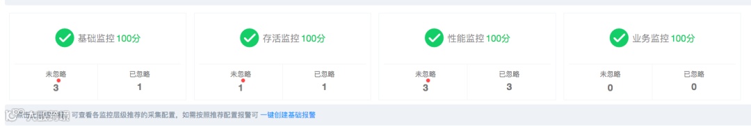 基于对业务配置的指标采集、告警规则的分析,帮助用户分层级地发现监控配置当中的疏漏,提醒用户在各个层级配置监控,提升监控覆盖度。