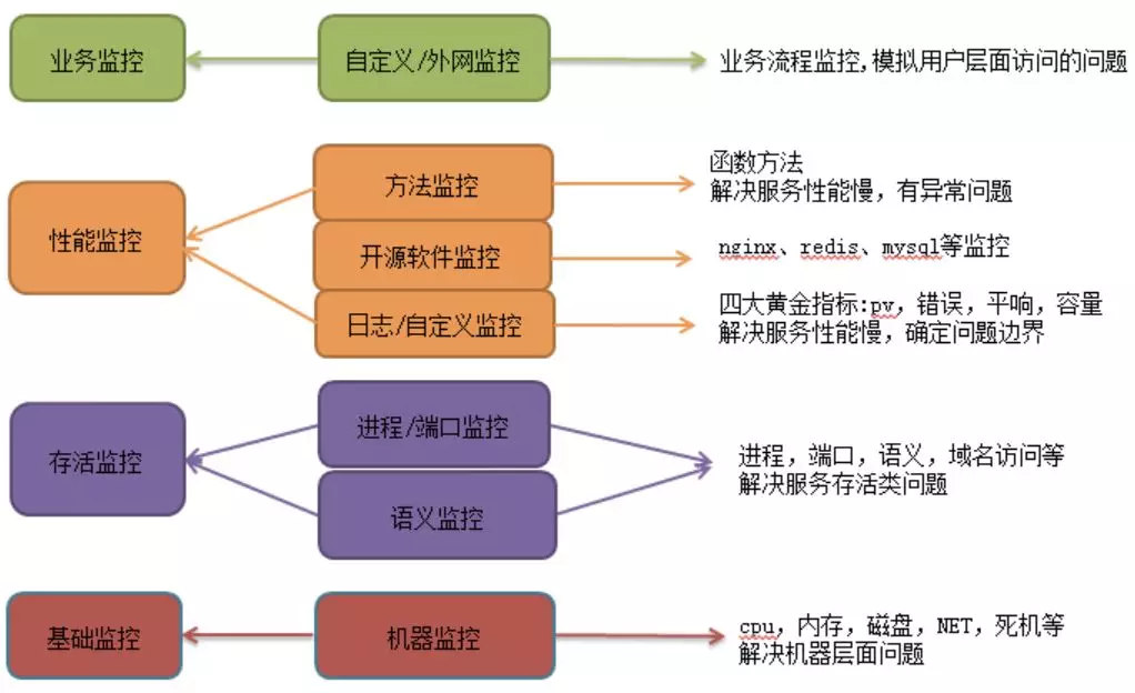 首先是基础监控,这一层主要解决机器、网络层面的问题,包括我们常见的CPU、内存,机器死机等问题;