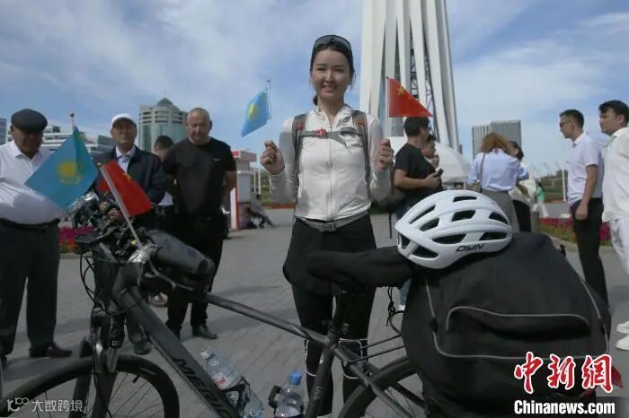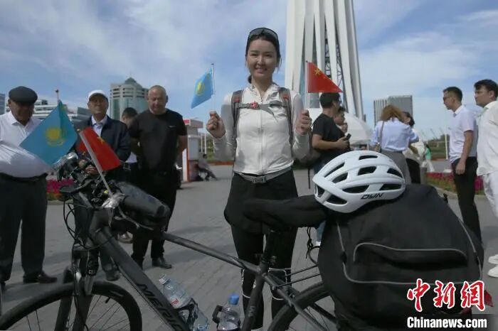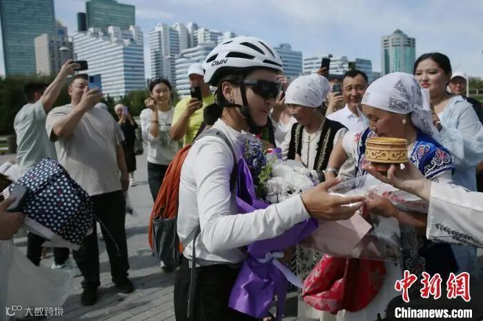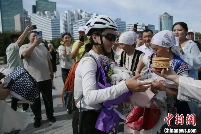 カザフスタンの首都アスタナのランドマークであるモニュメント兼展望塔・バイテレクの前に現地時間今月13日午後、中国とカザフスタンの国旗を付けた自転車がゆっくりと止まった。自転車がまだ完全に止まっていないうちから、到着を待ち構えていた大勢の現地の華人や華僑が民族楽器のドンブラを演奏したり、キャンディを投げたりして中国人女性・布爾蓮さんの到着を祝った。楽器の音や歓声、心のこもった歓迎の言葉は途切れることなく、その場は大いに盛り上がっていた。