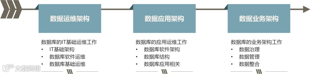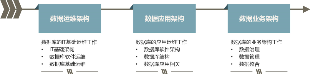举一个转型业务架构规划路线,随着公司数据应用水平的不断提高,DBA工作重心也应从基础运维的工作转向数据业务架构师的角色。