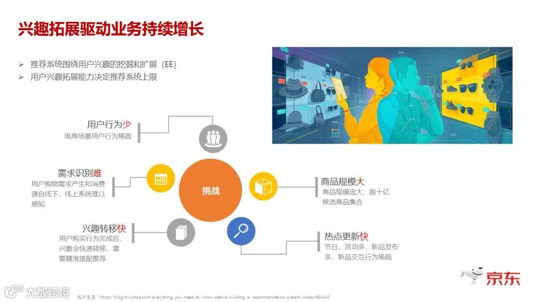 第二部分会从几个维度讲一下在京东推荐系统上做的一些创新,尤其是在用户兴趣拓展这个维度上。因为就电商场景来说,所有的电商推荐系统都是分成捕捉用户兴趣和满足用户兴趣,然后也包括兴趣的拓展。在电商角度来说,用户兴趣的拓展相对他类型的推荐系统可能会更重要一些,实际上,在京东推荐系统里面,用户兴趣拓展这部分的曝光占比超过了一半以上。