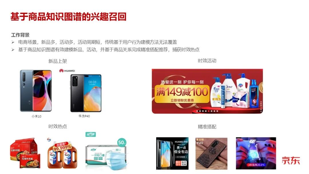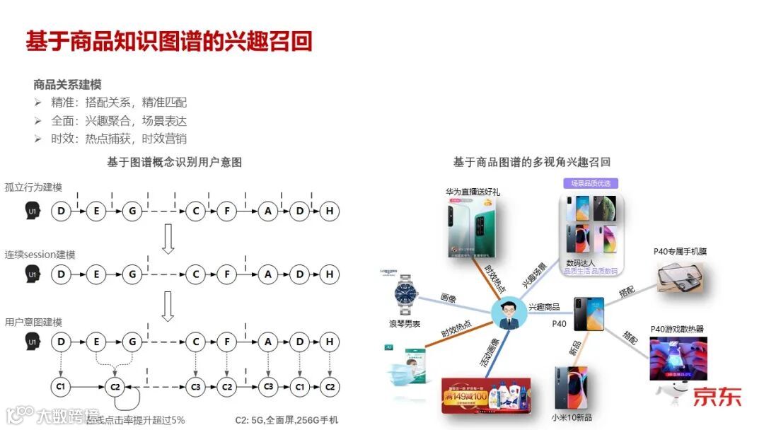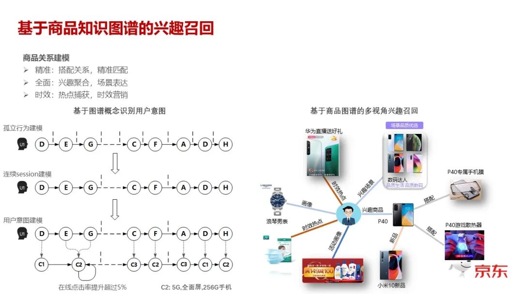 上图右侧的图,其实刚刚已经大概提了,在一个用户跟一个商品发生关联之后,那么基于商品的知识图谱,你就可以建立出来很多关联。这是在召回方面我们所做的一个创新,其实最主要的工作就是知识图谱的构建。