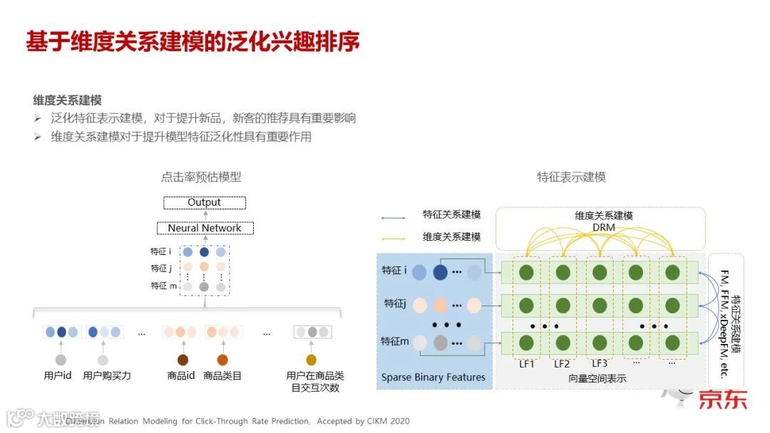最近,大家觉得这个 Concat 做得比较糙,通常的做法不再是横着 Concat,而是把它组成一个矩阵。这个矩阵进去之后,在特征的纬度之间,大家可以看到右边这个图,就是通常的 FM,或者 FMM,或者一些常用的方法,这些都是我们在不同的特征之间去建立关联。我们的创新是在不同的纬度之间也建立同样的关联,去构建纬度之间的关系,就是想把这个 embedding 的特征刻划得更精细一些,以提升整个模型的表达和泛化能力。
