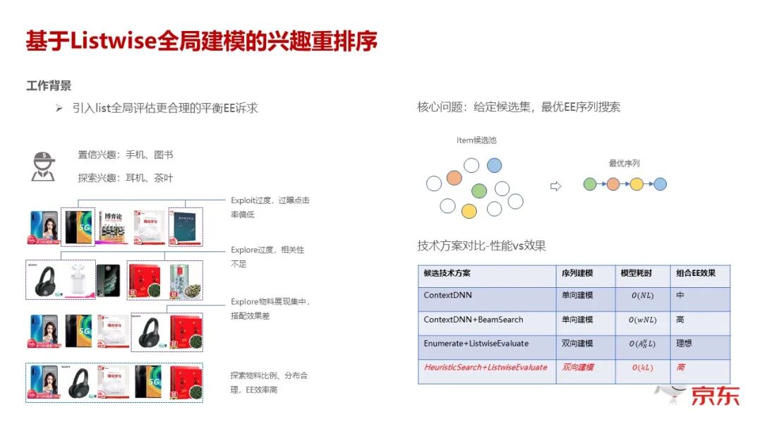 上图中,大家看一下左边的示意图。我们发现用户已经主动浏览了一些手机和图书,那么我通过一些其他的行为能够猜测出,他还会感兴趣的东西是耳机和茶叶,那么我怎么去做合理的搭配?这里边举了一些例子,如果说你做得不合理,有可能出现的是大量已知的兴趣,或者反过来,大量的结果是你 Explore 的,不管哪种情况,效率都是低的,甚至是说你两种情况都搭配出来,但是如果说他们呈现出来的顺序不合理,那么最后的效果也是不好的。
