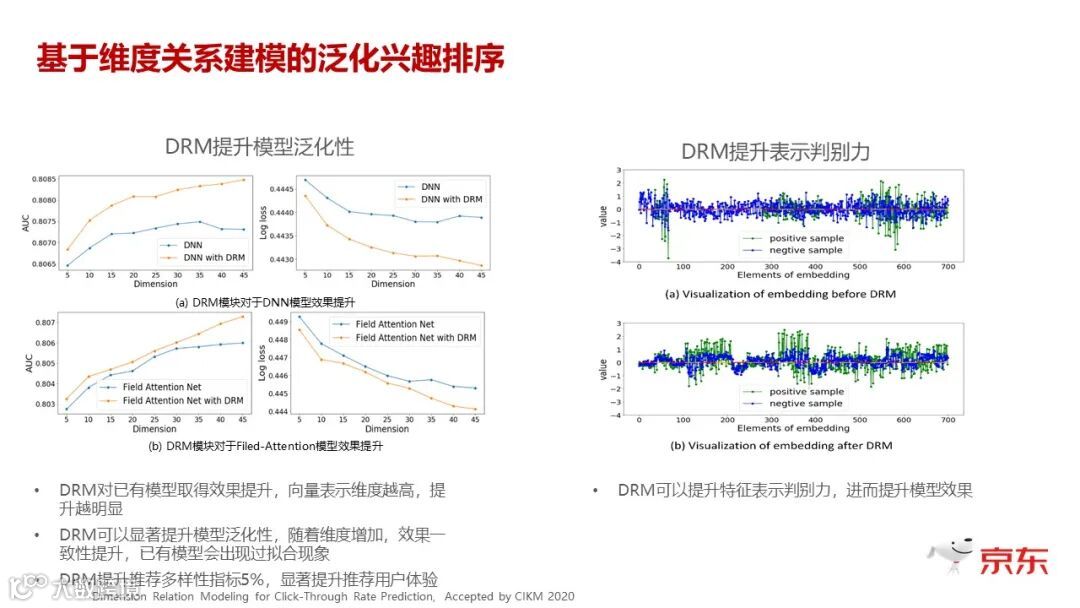 所以我们可以看到,DRM 层引进之后,明显的改变就是对你输入的语言 sparse 特征转换过 embedding 刻画得更精细了,模型的泛化能力有了明显的提升,尤其是在 embedding 纬度高的时候,它能够明显地解决原有模型的过拟合的现象。