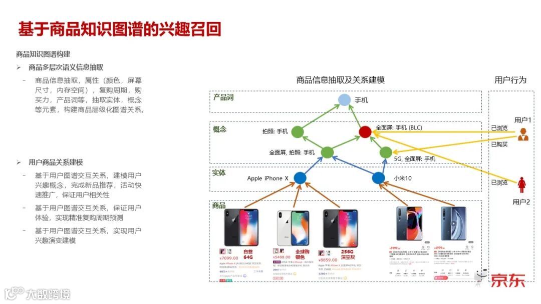 再上面一层才是手机,所以其实你可以看到这是一个从细到粗、逐步抽象出来的知识网络的结构。所以它结合了一些商品抽取的信息,也结合了一些用户的行为,那么有了这个基础的商品层次的结构之后,我们很多的关系构建就不需要基于最底下这层,因为最底下这层的量级是特别大的,数十亿级别的,在这个级别下面的东西其实没有泛化能力,如果说你想去做基于行为,或者基于其他方式去构建,构建出来的 数据 都会是特别稀疏的,所以我们更多的关系是基于上面那三层,尤其是中间那两层构建的一些商品的信息。