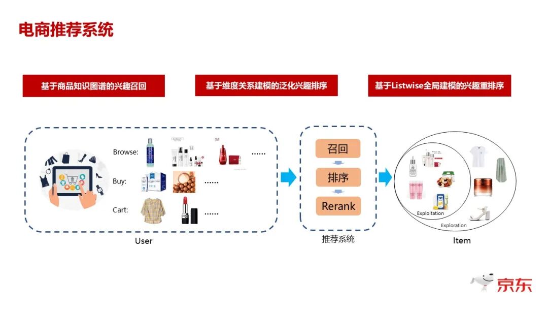 大家能看到下图中的三个环节,左边是描述传统的、我们记录下来的用户的行为,包括他的浏览、购买、加购等所有电商平台能够在线记录下来的行为,正常的推荐系统都是分为几个环节:
