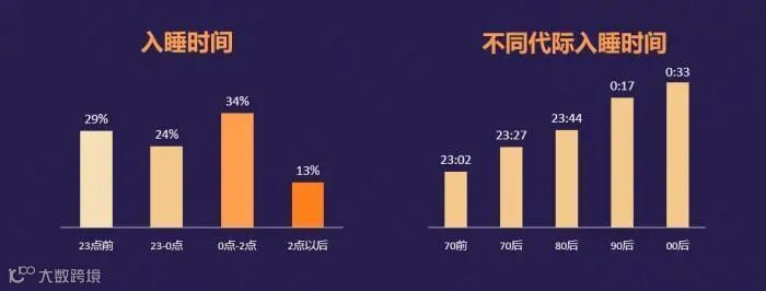 「70前」や「70後(1970年代生まれ)」の定年退職者は、「夜中に目が覚める/朝早くに目が覚める」や「夜中にトイレに行く」といった悩みが多く、「00後(2000年以降生まれ)」や「90後(1990年代生まれ)」の若者は「寝つきが悪い」という悩みが多かった。