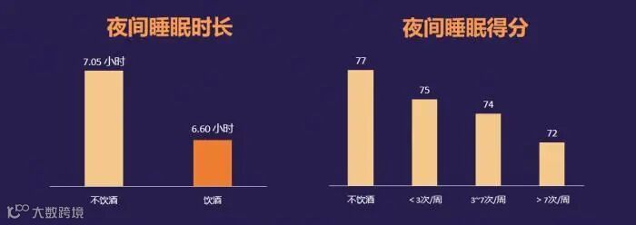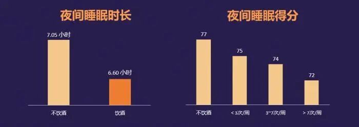 飲酒するグループは、しないグループに比べて夜の平均的な就寝時間が27分少なかった。また、飲酒の回数が多いほど、睡眠の質が悪く、1週間に7回以上飲酒するグループは飲酒しない人に比べて睡眠の得点が4点低かった。