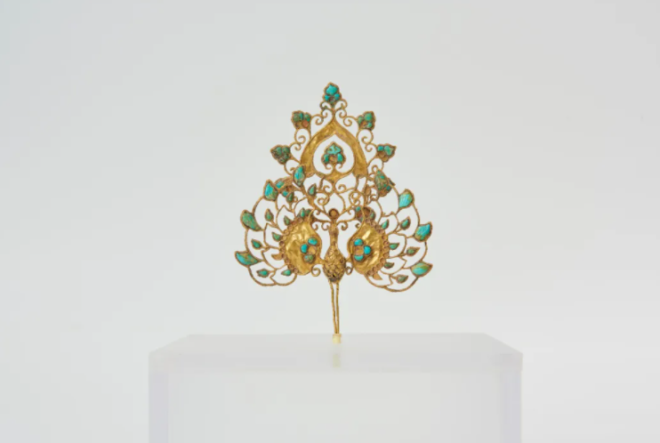 西蔵(チベット)自治区は、中国でもターコイズ資源が豊かな地の一つ。鮮やかなスカイブルーのターコイズに、古代「吐蕃」の人々も魅了され、それを金器に散りばめるというのが、彼らの伝統となってきた。この髪飾りも、ターコイズと金が見事に組み合わされた逸品となっている。