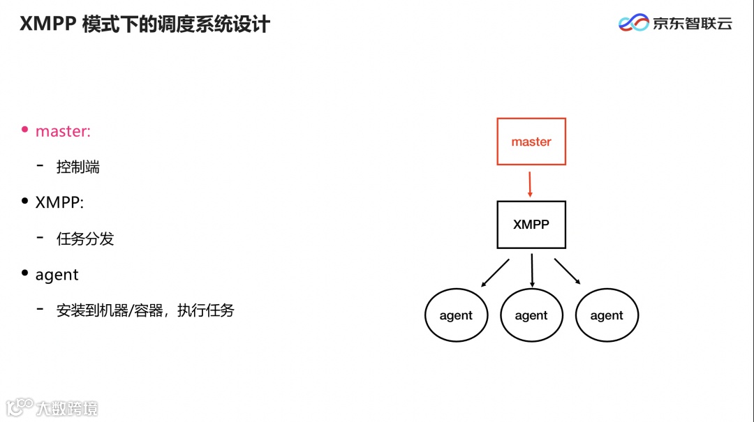 更为复杂的是 master 的设计。对于小公司而言,只需一个 master 可能就足以管理所有机器,那么系统只需单个 master 作为调度器即可。但对于京东这样大规模的企业来说,需要多个 master 来分担庞大的任务负载,就需要将它们放在多个网络下面。