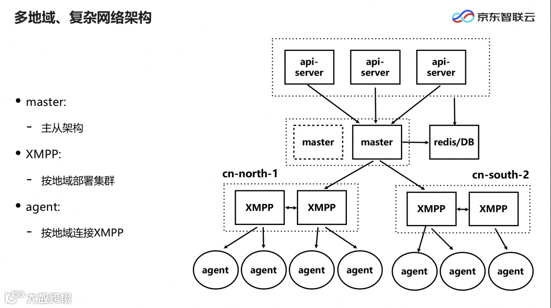 存在多个 master 时就需要考虑是否拆分 api-server。京东的选择是不做拆分,而 api-server 承接的业务逻辑最终形成一个 Redis 数据库作为一个中间件。负责不同地域的 master 启动后从中间件获取数据并分发任务,任务完成后也保存在中间件内。当外部用户查询 api-server,想要获得当前的任务状态时,api-server 会直接查询中间件,而非某个 master。