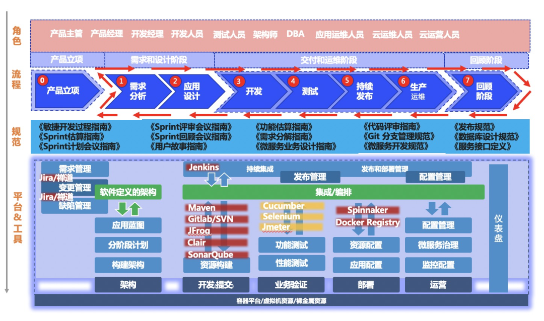 另外,在工具链的选择和管理上,需要进行统一。DevOps 工具链分为角色、流程、规范、平台和工具四大类别。其中,从产品经理到开发、运维、运营人员等等,都是工具链中的重要角色。DevOps 实际生产中存在许多流程,每个流程都需要工具化、具体化,以免遗漏。开发工作中涉及众多规范,各种规范共同形成了工具链中重要的基石。