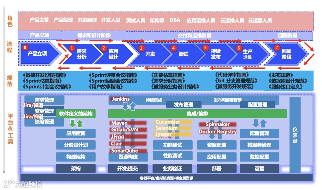 在企业打造 DevOps 平台的过程中,首先要明确的是 DevOps 的目标。伞亚朋老师认为,DevOps 主要解决的是人员沟通问题,它可以弱化人与人之间的沟通壁垒,使岗位之间信息流转更为明;从范围来看,DevOps 狭义上是产品从需求到交付、迭代的过程,广义上可以则涵盖整个公司和产品生态链。