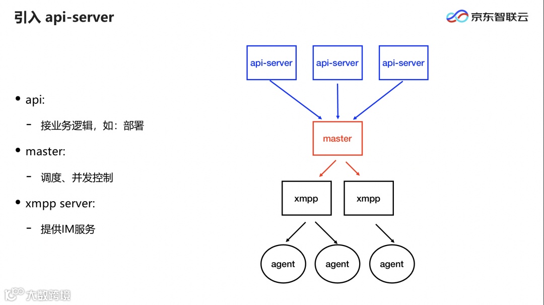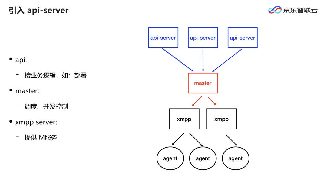 另一方面,控制系统的目的并非单纯地控制机器本身,而是要对外提供服务。所以在上述模型的基础上还需要一个 api-server,用来包装业务需求,将其变为可执行的任务通过 master 分发给 agent。加入 api-server 后模型也比较简单:
