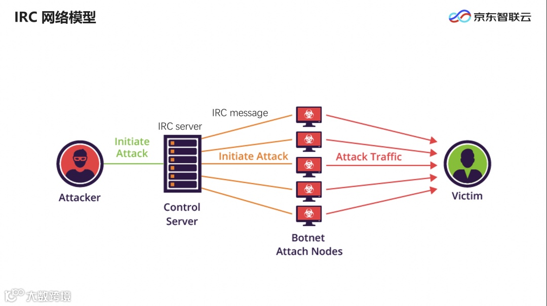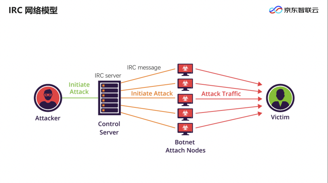 在 IRC 模型中,攻击者自己建一个 master,再加一个控制服务器来控制僵尸网络中的节点;攻击者通过 master 连接到控制服务器上即可操纵僵尸节点发起攻击。需要注意的是 IRC 是匿名聊天协议,系统不关心连上控制服务器的是什么身份,只要能连上就可以实施控制。