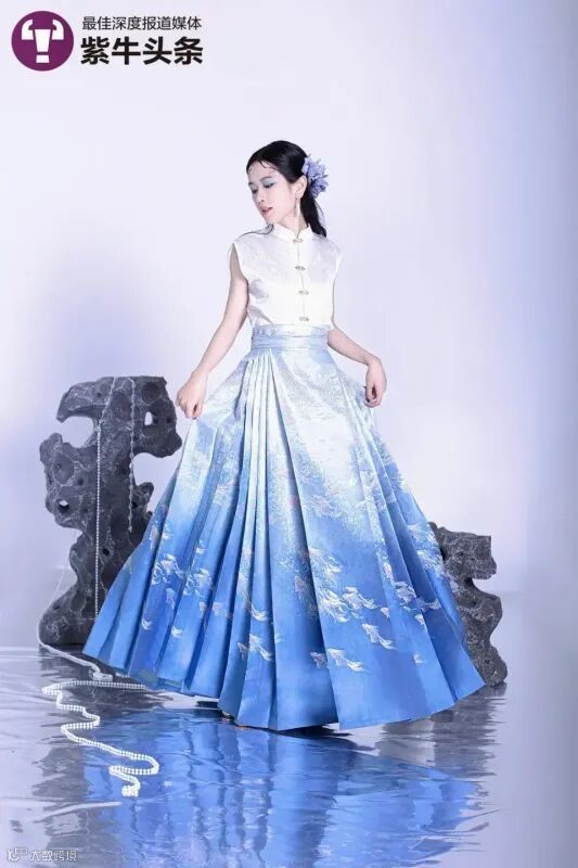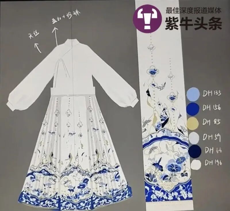 劉雯悦さんがデザインした「青花瓷」(染付)をテーマにした「馬面裙」。