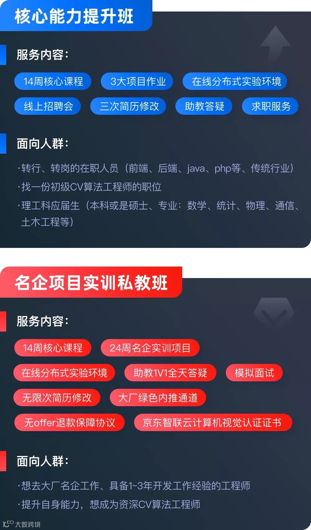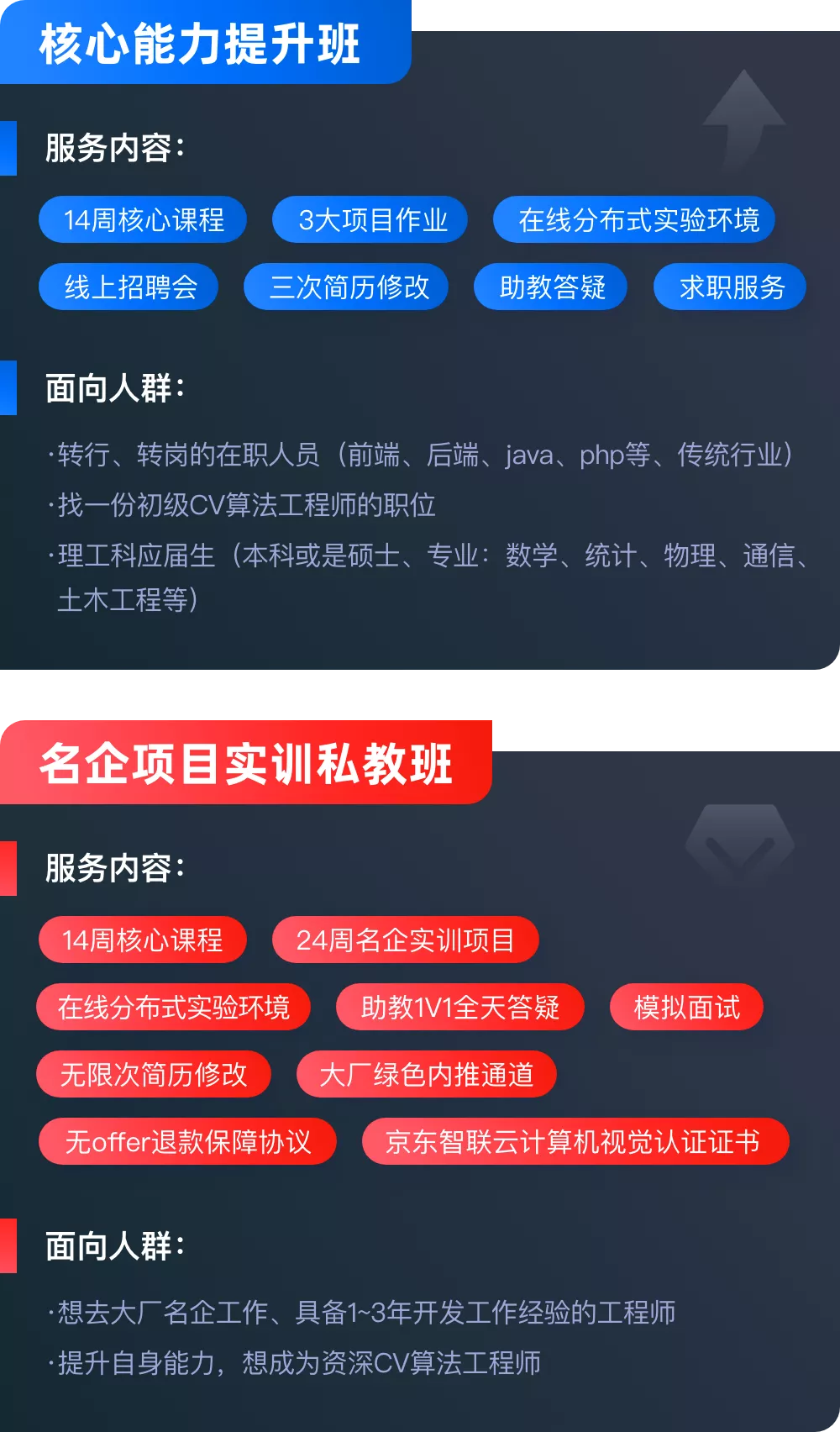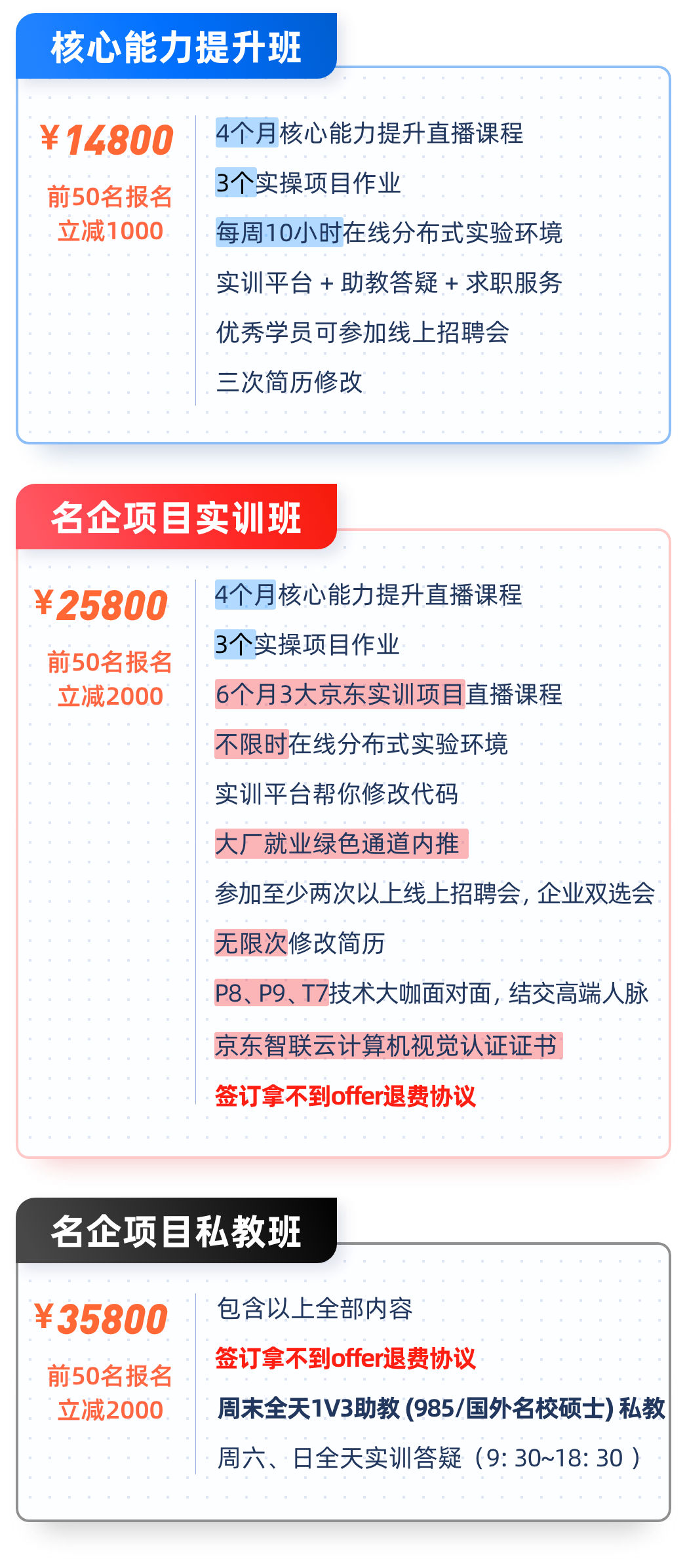 本课程根据学员的不同需求,设置了两种培养计划:核心能力提升班+名企项目实训私教班。