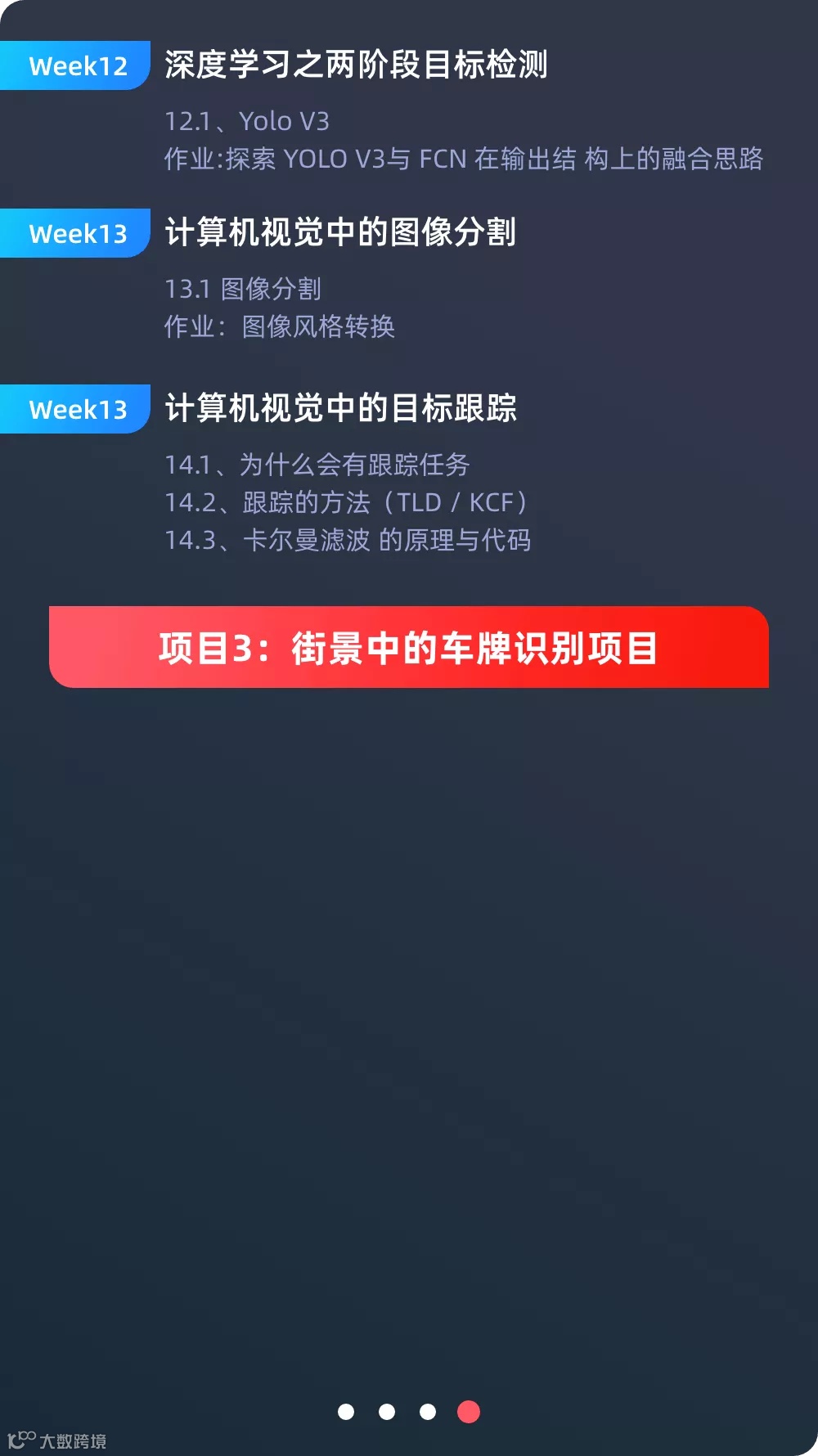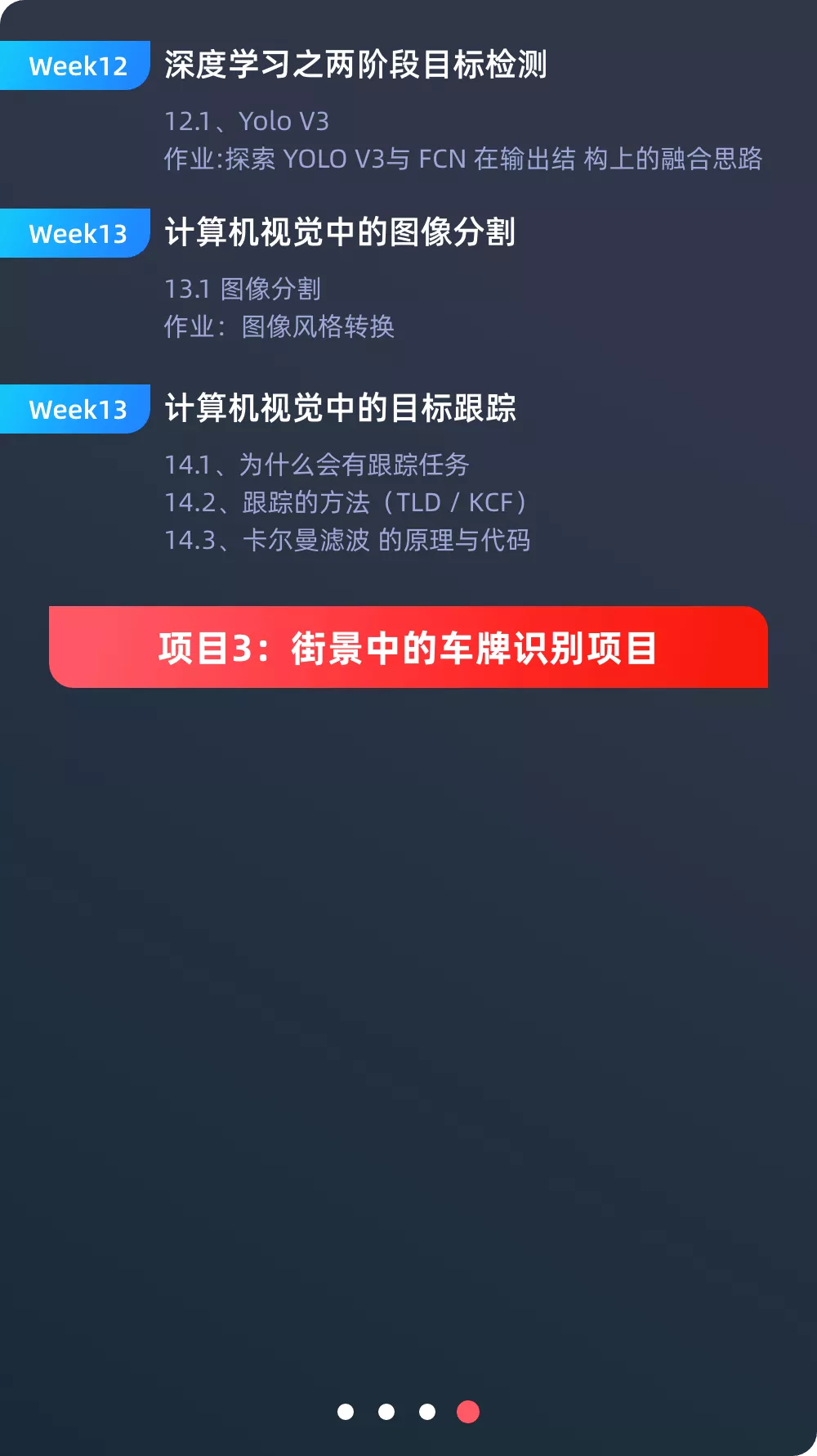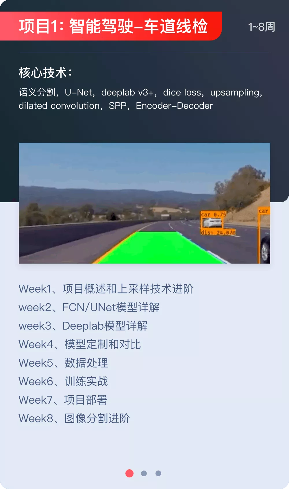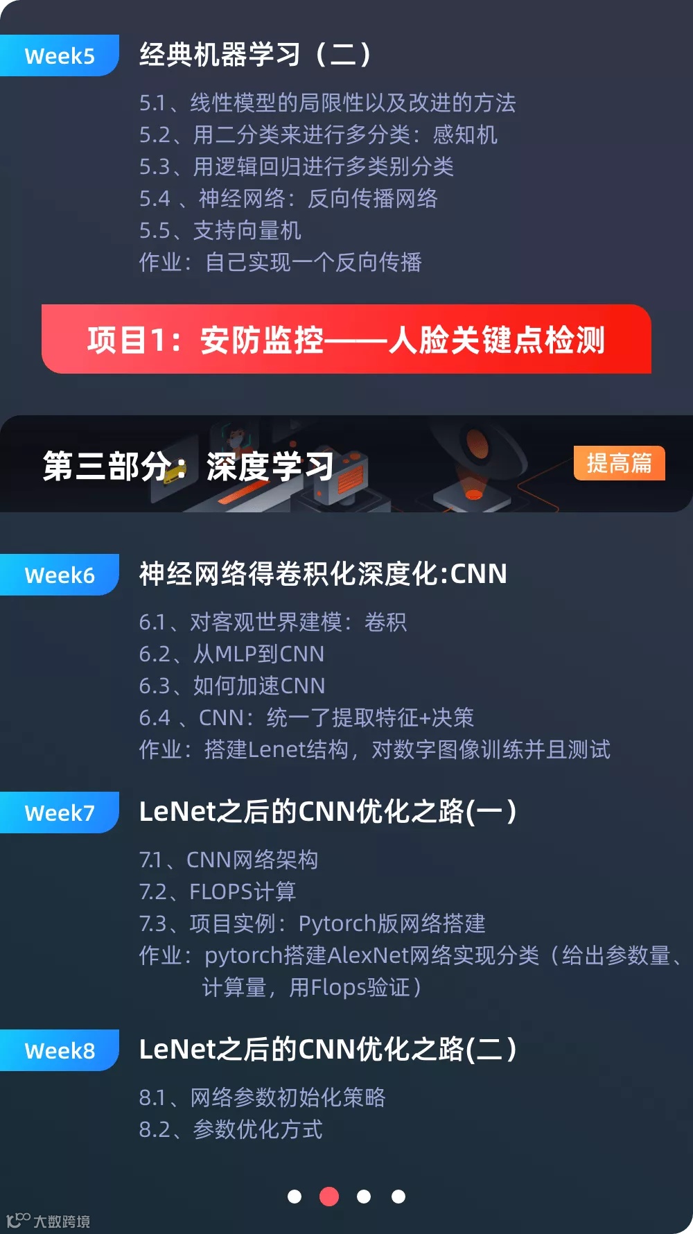 为了满足不同基础的学生需求,我们还提供了预修课、专业选修课、公选课、提升课。预修课和公选课帮助学员具备人工智能中的数学、英语、python编程、算法分析、数据分析的基础。专业选修课是CV方向的研究领域,能让学员了解该领域的发展。提升课帮助学员掌握必备的深度框架,让学员深入项目中提升自己的能力。